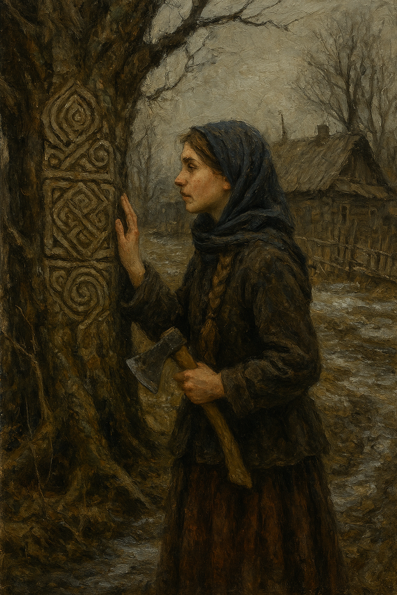 Однажды, когда Арина рубила лучину у поленницы, её взгляд упал на старую липу, росшую на меже. Ствол её был покрыт глубокими, причудливыми наростами. И в тот миг, скосив глаза под определённым углом, Арина увидела. Не глазами, а тем внутренним зрением, что обострилось после Нави. Узоры на коре сложились не в хаос, а в строгий, повторяющийся порядок. Спирали, вписанные в квадраты, тройные волны, расходящиеся из одной точки. Это был не природный рисунок. Это было письмо. Древнее, забытое, выжженное самой силой места, может, ещё прапрадедами, которые знали больше нынешних.