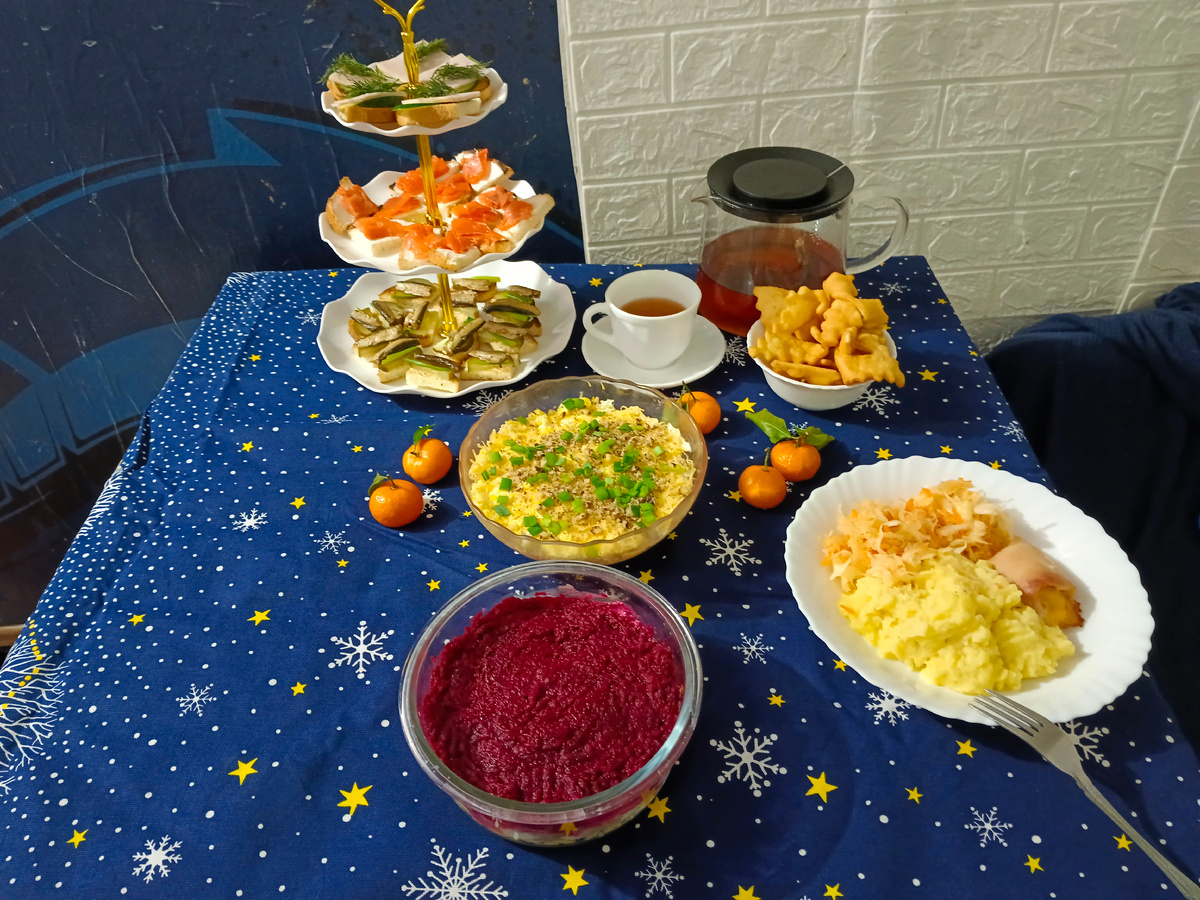 Пюре с куриными рулетами и салаты (курица с ананасом и сельдь под шубой) были приготовлены мной ещё днём. Хворост привезли родители мужа, привезли ещё подарки внукам. Юле домик с принцессой, Руслану инструменты в контейнере. Дети довольны. Муж и старший сын успели поесть вечером и детей накормили перед сном, так что голодной садилась за стол только я. В эти году от алкоголя решила отказаться. Пила вместо шампанского чай. Мужчины мои ели только бутерброды.