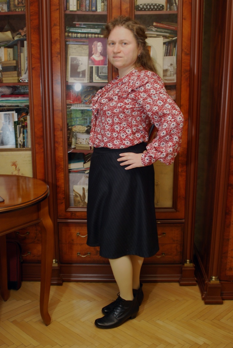 С Новым Годом! А также с наступающим Рождеством Христовым! Это фото сделано раннее кануна Нового Года. Здесь я экспериментировала с завивкой и надела свежесшитую юбку и обувь из секонд-хенда из раздела "Эксклюзив". Блузка вискозная тоже из секонд-хенда. Юбки есть фото и будут новые, так как я в ней кое-что передедываю (иногда сделаешь фото и заметишь косяки, какой-то недостаток, который будет раздражать, не нравиться, лучше исправить, особенно при моём подходе к шитью каждой вещи.) Нелегко было шить из 1 м ткани такой фасон. Это не полусолнце, а четверть солнца с кокеткой, которая больше похожа на пояс и которую с этой блузкой не видно. (К слову, по основе юбке 1900х я бы меньше возилась, так как там не нужно равнять низ, например. Ещё были трудности со встречей двух косых. Блузка эта не очень подходит для демонстрации пояса-кокетки юбки, поскольку, хоть она и заправлена, но всё равно нависает. Образ, скорее всего, можно отнести к вольной интерпретации стиля 1940х годов. С