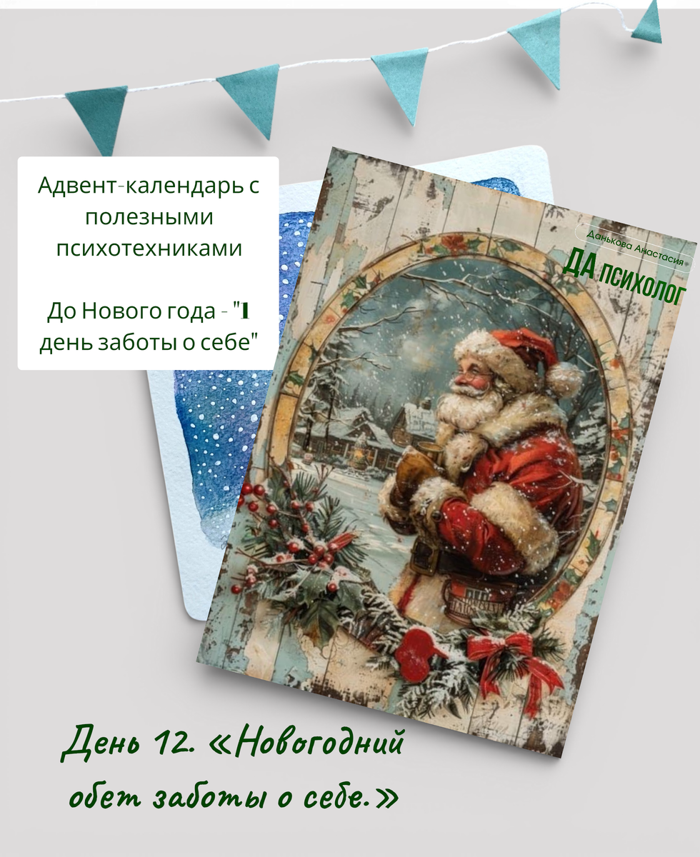 Сформулируйте для себя 1-2 ключевых намерения на следующий год, например: «Я обязуюсь быть к себе добрее», «Я обязуюсь чаще давать себе отдых», «Я обязуюсь слушать свои истинные желания». Напишите свой обет на красивой открытке и положите его под елку или в другое особое место, - такое, в каком бы вы разместили ГЛАВНЫЙ ПОДАРОК ДЛЯ СЕБЯ. Вы прошли «12 дней заботы о себе» и готовы к Новому году!
