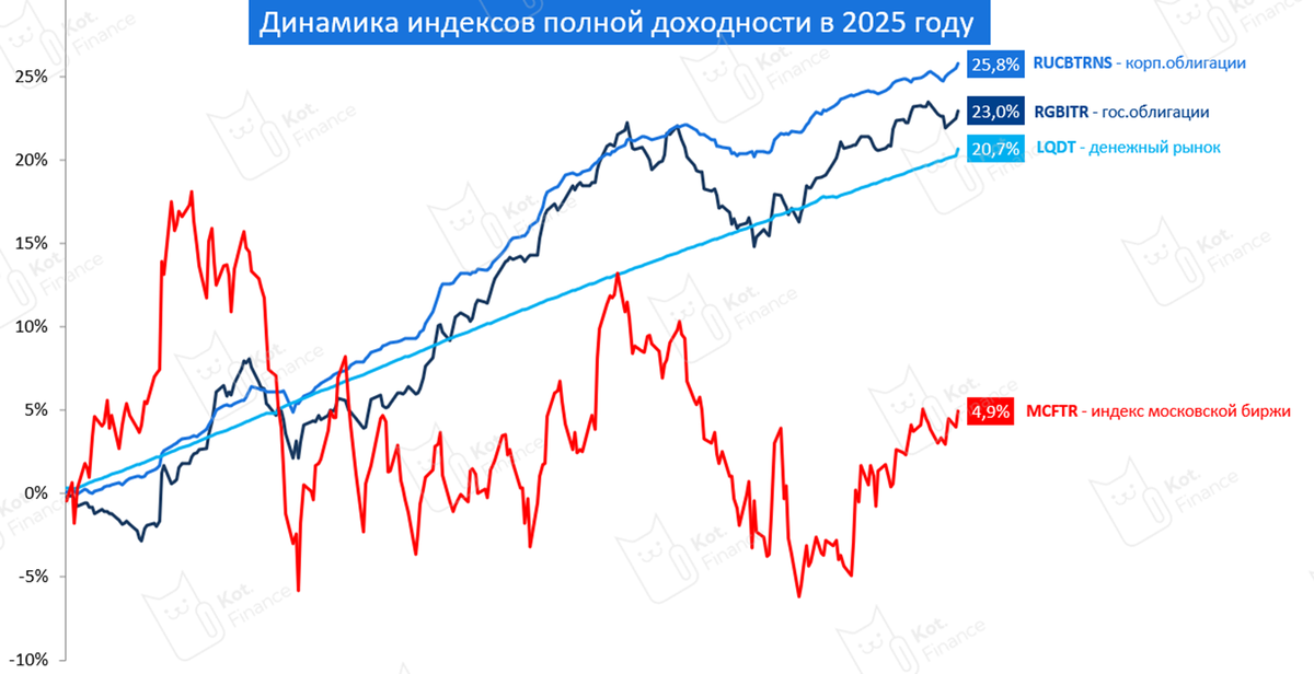 Закончился интересный 2025ый, пора подводить итоги. Назвать победителей и побежденных легко. Истина глубже На начало года разброс прогнозов по индексу был 2850-3500, а конец года - 2766. Никто не угадал, но Сбер был ближе всех. При этом, прогноз Сбера основывался на ожидании ключевой ставки 25%. 2025 год оказался не лучшим годом для инвестиций в акции. Это второй подряд год, когда номинальный индекс закрывается в минусе, а индекс полной доходности около нуля Индекс акций (даже с учетом дивидендов) оказался на последнем месте, показывая результат +2,5%. Волатильность фантастическая: в первом полугодии доходило до +18%, нижняя точка около -7% с начала года. Это четвертое место из 4 как по доходности, так и по волатильности Третье место занимает LQDT/TMON - фонды денежного рынка (20,7%). Низковолатильные и предсказуемые по доходности. Мифы фондов денежного рынка мы разбирали, и у нас получалась понятна доходность ниже ключа. В среднем, КС минус 0,3%. Но с такой ключевой ставкой и этог