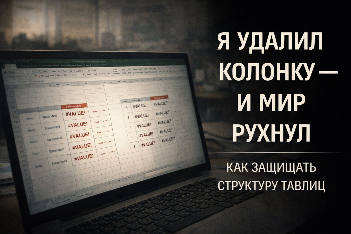 — цифры стали «странными» А вечером выяснилось: сломалось всё. Excel не злой. Он просто буквальный. Если: одна колонка тянет за собой всю систему. «Эту колонку никто не использует». Использует. Просто молча. В: Не вопросом «кто удалил». А фразой: — «Почему ты не предусмотрел?» Excel снова становится свидетелем. А исполнитель — крайним. Проблема в отсутствии защиты. Если файл: он обязательно будет сломан. Это вопрос времени. Не данные. Структуру. Потому что данные можно восстановить.