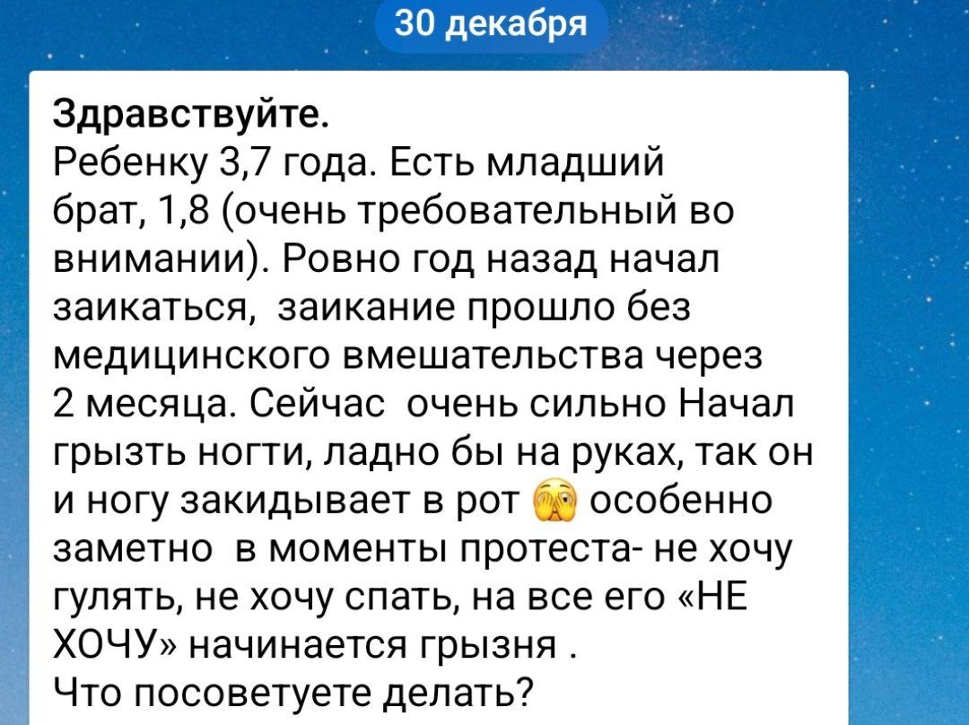 🤍В вашем случае оно ушло в ногти, это тоже про тревогу. 🤍Если со стороны врачей все хорошо, то максимум внимания ребёнку, находить время с каждым отдельно обязательно, учиться выдерживать слезы ребёнка, грызёт ногти когда что-то не хочет, как будто нет слез адаптации. Что-то идет не так, как хочет, и он так справляется с чувствами. 🤍🤍🤍 🤍Ну ругать, отвлекать 🤍Максимум внимания, контакта физического и эмоционального 🤍Игры на снятие тревожности (дома это пластилин, глина, рисование, игры в песке) 🤍Книжки про чувства читать 🤍Много разговаривать проговаривать все чувства ребёнка. 🤍Не сталкивать детей "лбами", максимально исключить поводы для ревности детей. Вам много терпения и сил. #вопросответТН