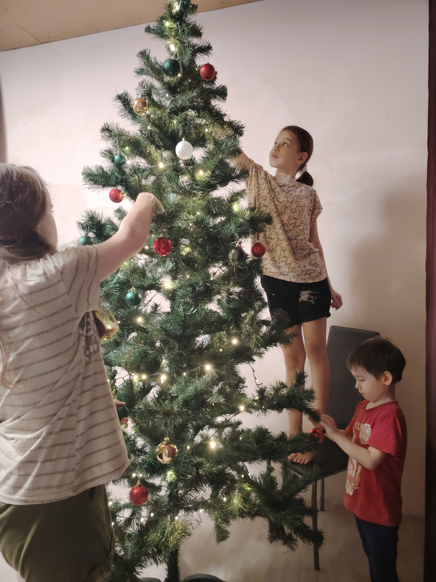 За несколько дней до Нового года мы вместе украсили дом: развесили гирлянды, установили ёлку и нарядили её яркими игрушками. Дети с особым энтузиазмом участвовали в процессе — выбирали, куда повесить каждую игрушку, спорили, чья очередь вешать шары. Их радостные лица и горящие глаза уже создавали праздничное настроение.