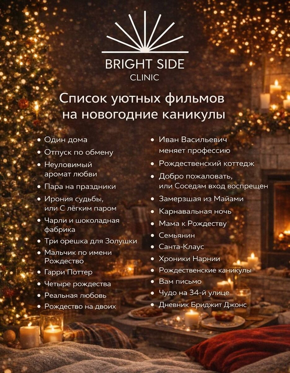 ? 😊 Запасайтесь пледом, мандаринами и хорошим настроением 🍊✨ — мы подготовили для вас список уютных новогодних фильмов, 🎞️🍿 которые подарят тепло, улыбки и атмосферу праздника Наслаждайтесь каникулами и отдыхайте ✨ А какие ваши любимые фильмы для создания настроения? 🤍