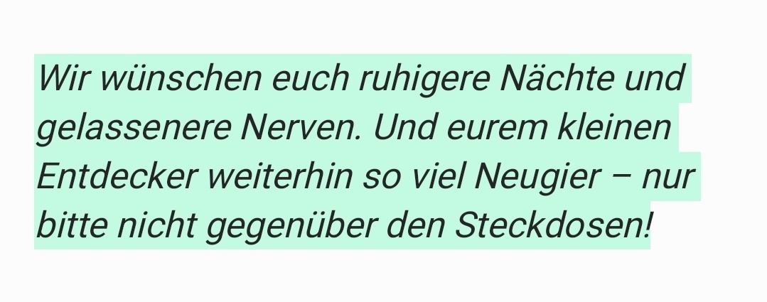"Желаем вам ночей поспокойнее и нервов покрепче. А вашему маленькому первооткрывателю - столько же любопытства. Только, пожалуйста, не по отношению к розеткам!"