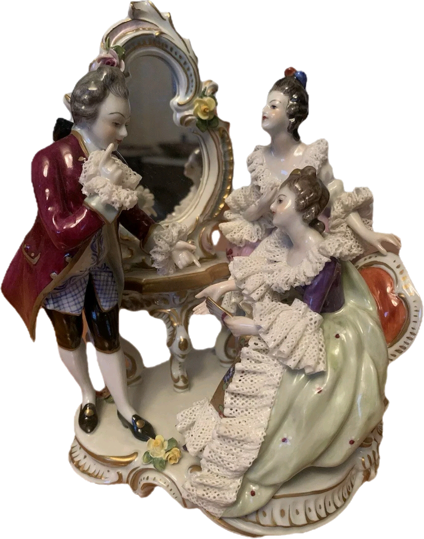- Как это делалось: Настоящее текстильное кружево пропитывалось фарфоровой массой (шликером) и наносилось на фигурку. При обжиге в печи ткань сгорала, оставляя после себя тончайшую, застывшую в камне сетку, которая выглядела как невесомое платье.