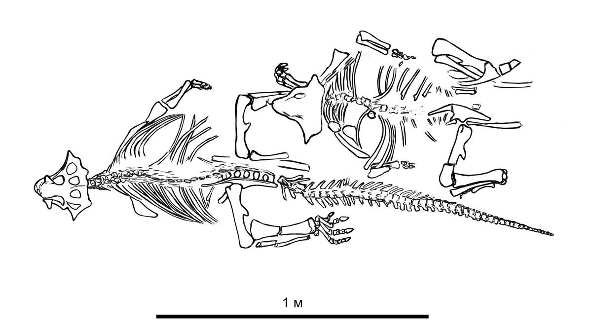 На рисунке показано расположение двух скелетов сибирских пситтакозавров (Psittacosaurus sibiricus), которые обнаружили в 1999 году в районе Шестаково Кемеровской области. У этой находки любопытная и довольно долгая история. Всё началось летом 1953 года, когда первые кости этих растительноядных рогатых динозавров, живших в меловом периоде на территории современного Кузбасса, нашли сразу два человека: московский геолог и томский доцент. Оба сделали открытие независимо друг от друга. После этого Палеонтологический институт Академии наук организовал экспедицию к месту находки. Однако она не принесла результатов: никаких костей обнаружить не удалось. Через пару лет по просьбе известного палеонтолога Ивана Антоновича Ефремова место решили осмотреть сибирские школьники. Они собрали много останков, которые, как им казалось, принадлежали динозаврам. Но позже выяснилось, что это были кости животных гораздо более позднего периода - молодой четвертичной фауны. После этого о местонахождении надол