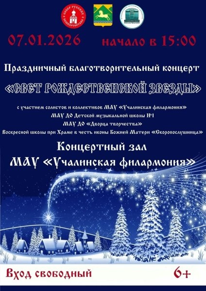 Приглашаем учалинцев и гостей города на праздничный концерт СВЕТ РОЖДЕСТВЕНСКОЙ ЗВЕЗДЫ с участием артистов Учалинской филармонии, учащихся и преподавателей ДМШ 1, коллективов Дворца творчества, воспитанников воскресной школы Храма в честь иконы Божией матери «Скоропослушница» Нач. 15:00 Вход свободный Источник https://uchaly102.ru/?p=118867