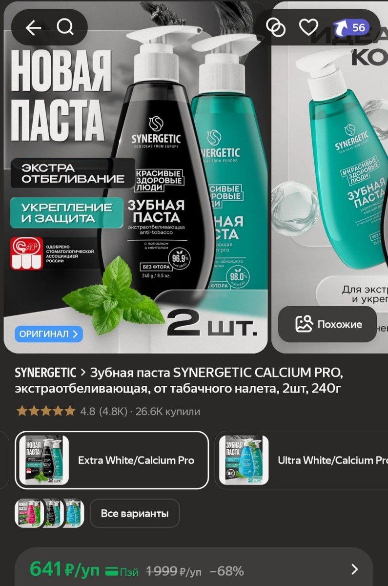 Зубная паста SYNERGETIC CALCIUM PRO, экстраотбеливающая, от табачного налета, 2шт, 240г за 641₽