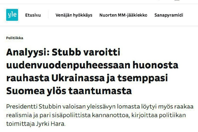 Александр Стубб в своём новогоднем обращении заявил, что предстоящее мирное урегулирование конфликта на Украине, вероятно, не будет полностью справедливым для Киева. По его словам, мир — это всегда компромисс. «Мы должны быть готовы к тому, что не все пункты мирного соглашения, вероятно, будут соответствовать нашему представлению о справедливости», — сказал Стубб. Тем не менее, он заявил, что, несмотря на то что мир в Европе сейчас ближе, чем в любой момент с 2022 года, Запад не может быть уверен, готова ли Россия к настоящему миру. 🌐 За Русский Мир©Резервный📣Наш Чат✔️Подпишись‼️