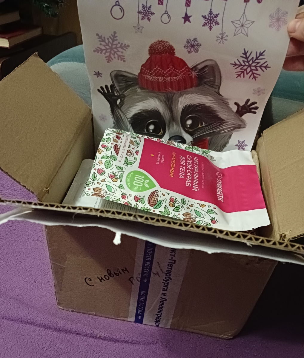 На этот Новый Год мне захотелось новогоднего чуда, и я решила поучаствовать в обмене подарками. Это второй раз, когда я участвую в таком проекте, и прошлый раз был довольно давно. В этот раз подарок мне пришел из д.Юкки Ленинградской области (на сайте почты России было написано "посылка из Парголово", потому в заглавии написала и то, и другое)). Посылку я держала закрытой до последнего, и вот, торжественно вскрыла сегодня) И должна сказать, чудо действительно случилось! В небольшой на вид коробочке меня ждала целая гора всяких разностей! При самом открытии посылки меня встретили вот такие замечательные наклейки для окон с очаровательным енотиком) Дальше меня ждали всякие средства для тела: тут и скраб, и маски, и мыло, и бальзам для губ. Вдобавок я получила небольшое кухонное полотенечко. Не забыли и про вкусности) А дальше стало еще интереснее) Наверное, моя Снегурочка ознакомилась с моим профилем в ВК, который я прикрепляла к анкете, и поняла, что человек я творческий. И не поскупила