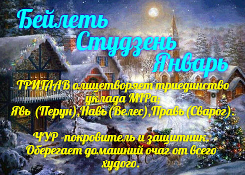 Какие праздники и знаменательные дни славяне отмечают в январе... Бейлетъ Студзень Январь-Просинец,Стужало,Ломонос... ПОКРОВИТЕЛИ : ТРИГЛАВ олицетворяет триединство уклада МIРа- Явь (Перун), Навь (Велес),Правь (Сварог). Чур-покровитель и защитник. Оберегает домашний очаг от всего худого. 25 декабря – 6 января Молодые Велесовы Святки Или первые Велесовы Святки в народе их ещё звали Кривые Святки. Время празднования Коляды. Встарь в честь этого праздника гуляли не один день! 1-2 января - День Великого Покоя и начало Недели Памяти ПраОтцов. с 1 января по 12 января - Дни поминовения ПраОтцов 2 января — Первая Пятница Богини Макошь.— Великдень.Время для обережного рукоделья и обрядов, посвящённых Великой Богине Судьбы. 6 января - Малый Водокрес Вода в озёрах и реках впервые становится волшебной, начинаются Большие Велесовы Святки. 6 – 19 января - Большие Велесовы Святки В народе их ещё звали Прямые Святки. 12 дней и ночей волшебства. В это время гадают о будущем, молодёжь устраивает весё