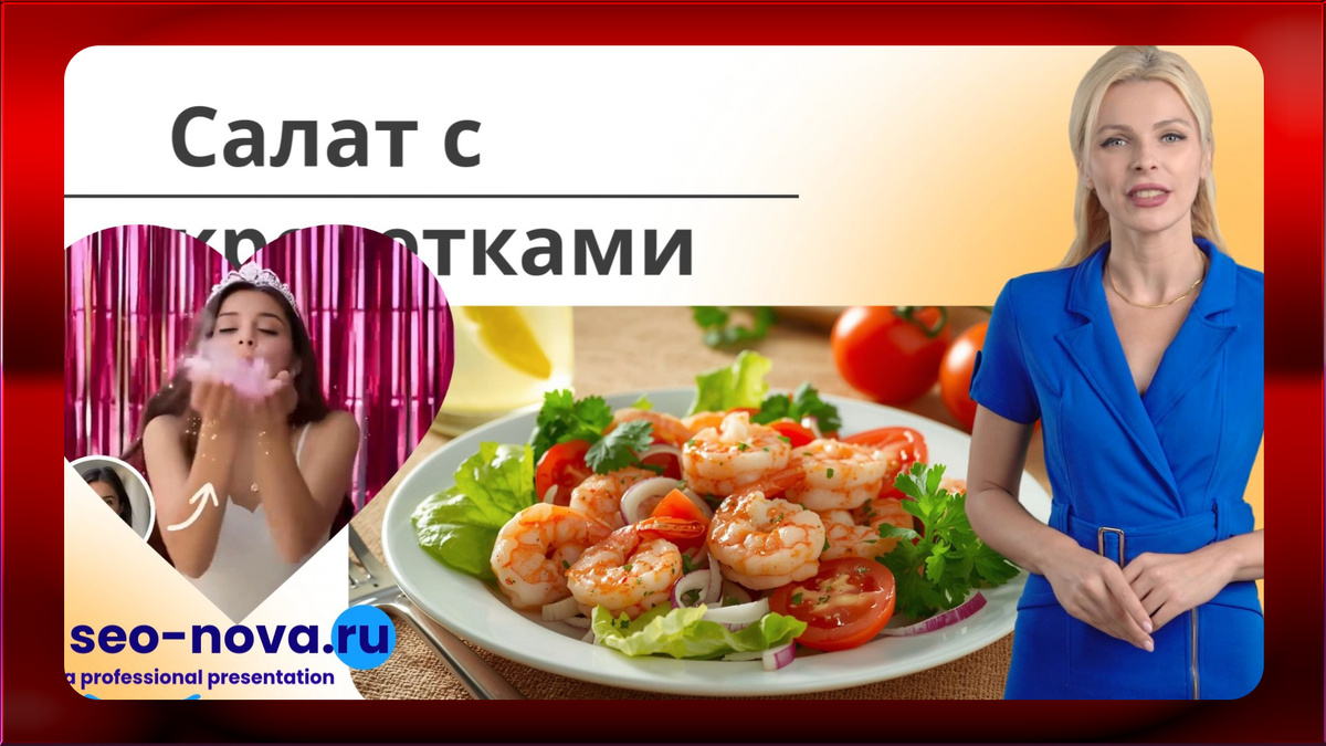 Салат с креветками Салат с креветками — это изысканное и полезное блюдо, которое идеально подходит как для повседневного, так и для праздничного стола. Нежные морские деликатесы в сочетании со свежими овощами и ароматными заправками создают неповторимый вкус и восхитительный аромат. Такой салат не только радует глаз своим ярким видом, но и насыщает организм необходимыми витаминами, белками и микроэлементами. Приготовление салата с креветками не требует много времени или сложных ингредиентов, что делает его доступным даже для начинающих кулинаров. В статье мы расскажем о лучших рецептах, вариантах подачи и тонкостях выбора ингредиентов, чтобы каждый мог самостоятельно создать это аппетитное блюдо у себя дома. Благодаря разнообразию способов приготовления салата с креветками он всегда будет новым открытием на вашем столе. Салат с креветками | С красной икрой Салат с креветками — идеальное блюдо для любителей морепродуктов. Свежие креветки придают салату нежный вкус и аромат моря. В соче