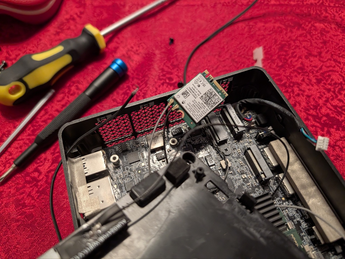 🔥💥 Minisforum 780XTX на 4pda Этот замечательный миник в условиях моей квартиры (а может и в целом) страдал от довольно плохого WiFi сигнала, поэтому было принято довольно радикально, но на мой взгляд достаточно вменяемое решение приколхозить к нему две внешние антенны. Вроде бы WiFi/Bluetooth адаптер у него стоит внутри приличный, но пару капель припоя под пластиковой крышкой на магнитах ему маловато. В данном минике, кто не знает, поверх радиатора с маленьким вентилятором в стоке идёт блочок с подсветкой, вернее такой мини-проектор на крышку миники различный негативов... Не знаю, кому как... но это то что я отключил первым делом... А теперь и вовсе убрал из корпуса, благо это делается откручиванием парочки винтов. После того как я успешно выбросил блок подсветки, внутри стало куда больше места и следовательно следующим шагом будет момент с заменой жужжащего малыша вентилятора, на полноценный Silent. С 4 pda знаю что у этого вентилятора нет PWM, поэтому буду брать с самыми низким