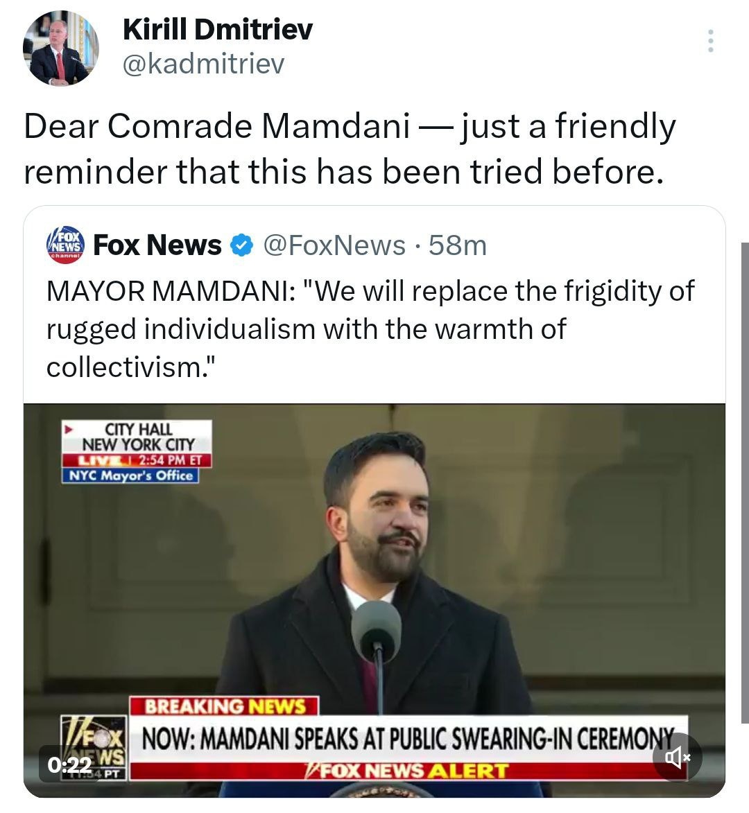 Dmitriev has a warning for 'Comrade Mamdani'