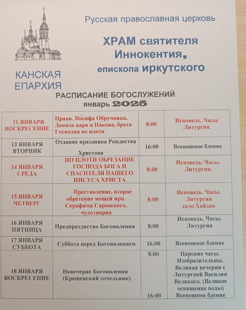 В храме святителя Иннокентия, епископа Иркутского, в селе Партизанское опубликован график богослужений на январь 2026 года