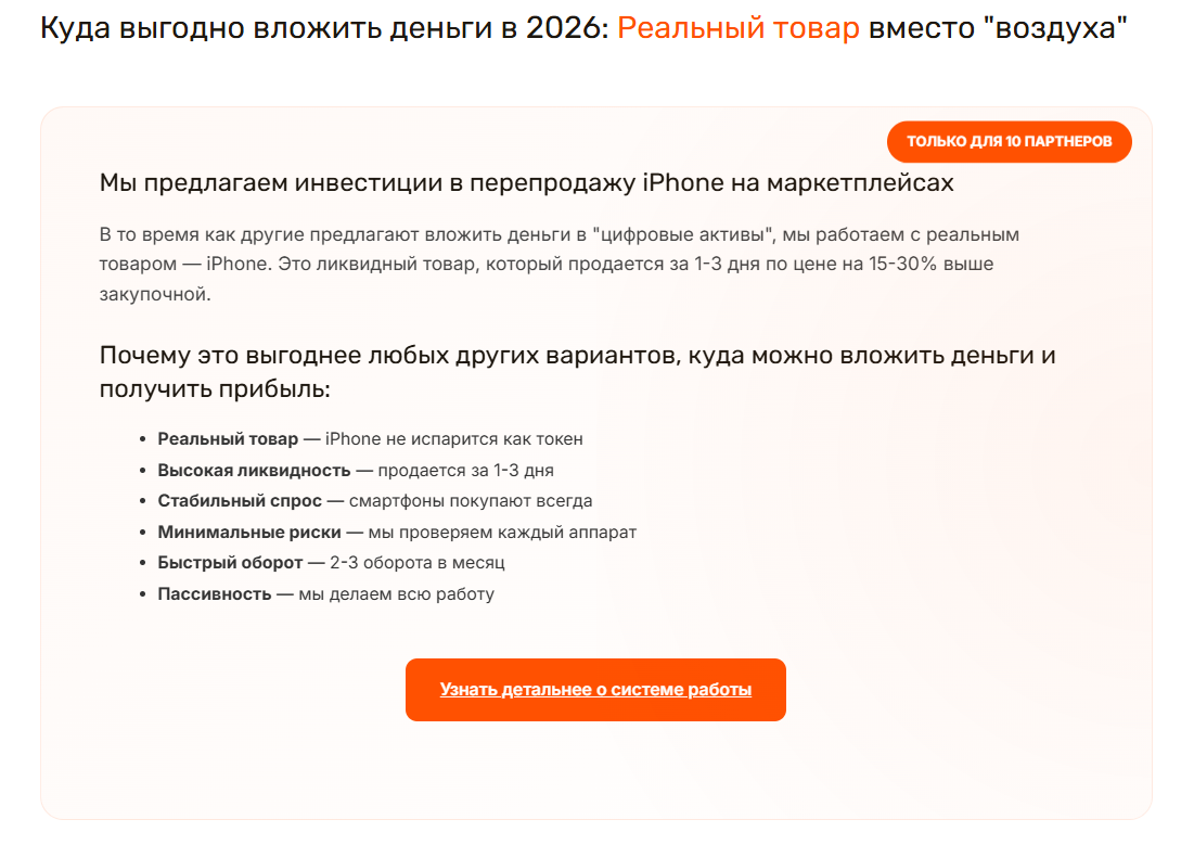 2026 год. Финансовые рынки лихорадит. Банковские проценты едва покрывают инфляцию. «Голубые фишки» и крипта стали синонимом непредсказуемости. Классический вопрос «Куда вложить деньги?» звучит сегодня с тревогой: «Куда вложить деньги БЕЗОПАСНО и с понятной доходностью?» Если вы задаетесь этим вопросом, эта статья — ваш ориентир. Я, Добряк, расскажу о реальной инвестиционной модели, которую мы, оптовая компания «Mobi Partner», оттачиваем с 2016 года. Это не высокорисковые спекуляции. Это инвестиции в ликвидный товар — в iPhone. Забудьте про «воздух» в виде цифровых активов. Золотое правило: ваши деньги должны быть обменены на то, что имеет ценность здесь и сейчас. Смартфоны Apple — эталон ликвидности. Их можно продать в любой день. Это ваш материальный страховой полис. Наша модель отвечает на главные страхи инвестора: Вы не просто «вкладываете деньги». Вы финансируете товарные остатки для бизнеса на Яндекс.Маркете. Вот как это работает: По сути, вы становитесь поставщиком для успешного