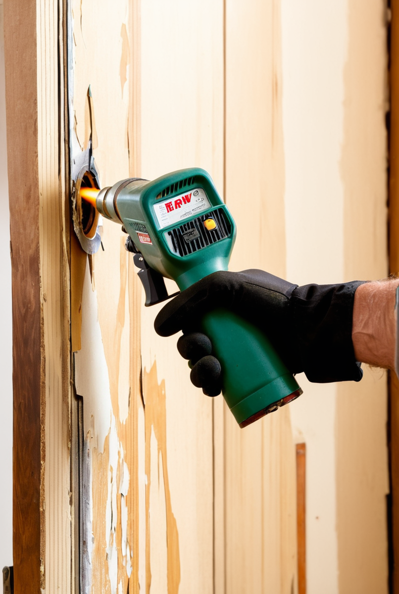- Снятие краски и удаление лака: Горячий воздух размягчает старый слой для легкого удаления шпателем.