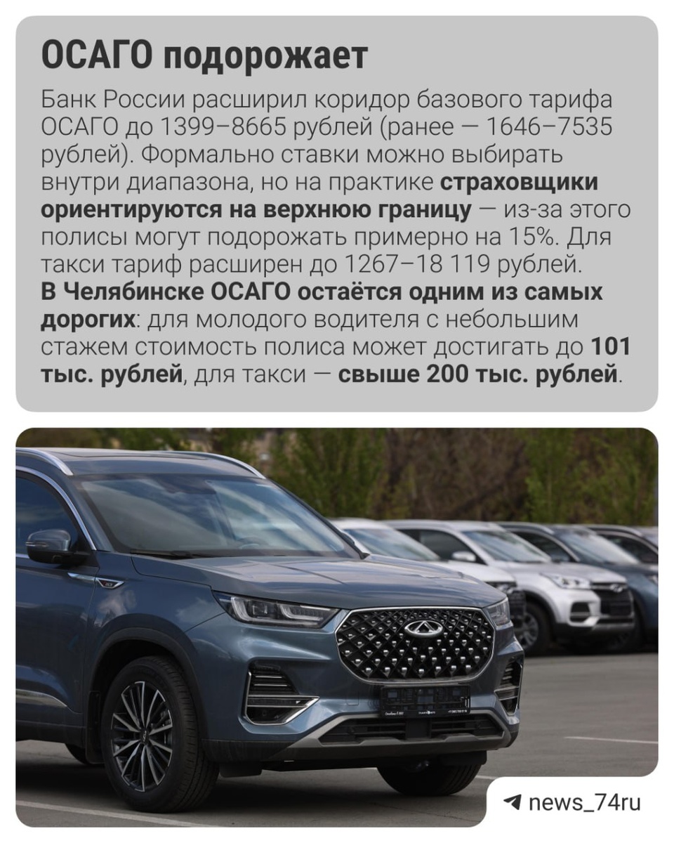 Общая тенденция 2026-го — увеличение всевозможных сборов с автомобилистов: помимо налогов и «утиля» подорожают права и даже техосмотр. Разбираем 10 самых важных изменений в КоАП, Налоговом кодексе и законе «О защите прав потребителей». 🟥 Транспортный налог. С 2026 года решением Заксобрания Челябинской области вдвое увеличен транспортный налог на автомобили с моторами мощностью до 150 л. с. Для остальных сегментов он и так был на максимальном уровне, разрешенном федеральным законодательством. Первый раз по новым ставкам южноуральцы заплатят налог в конце 2027 года, но начисление будет идти за 2026-й. Подробнее о новых тарифах — здесь. Еще девять законов для водителей собрали в карточки ⬆️