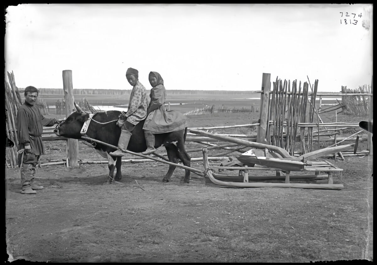 Мужчина с детьми на быке, 1902 г.