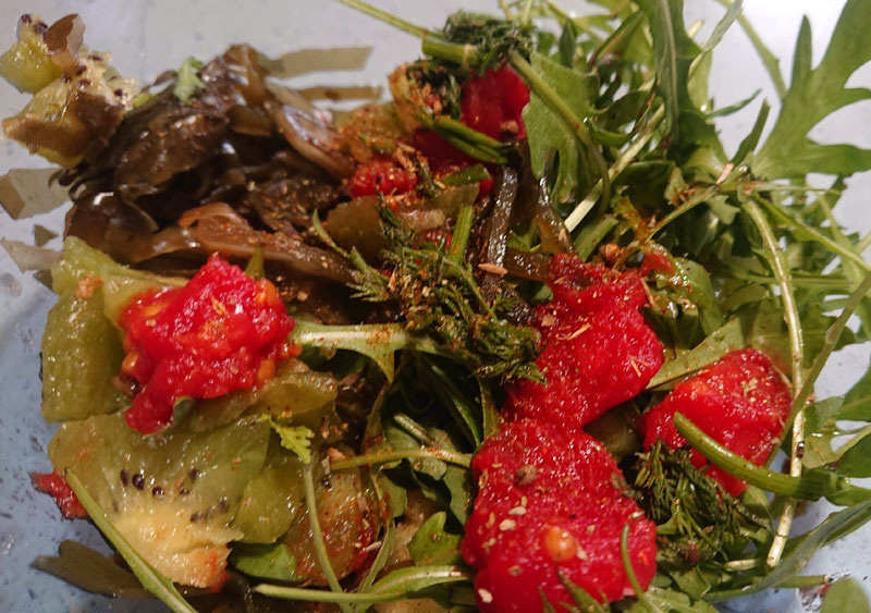 ✔ Ламинария (морская капуста) маринованная — 1 ст. л. (около 20 г); ✔ Киви — 1 шт.; ✔ Томат свежий или ферментированный — 1 шт.; ✔ Рукола — 20 г; ✔ Укроп свежий — 5 г (небольшой пучок); ✔ Масло горчичное — 1 ч. л.; ✔ Специи сушёные (базилик, орегано) — по вкусу; ✔ Соль – по вкусу. Зелень (руколу и укроп) промойте и обсушите. Укроп мелко порубите. Киви тщательно вымойте жёсткой губкой. При желании оставьте кожуру для максимального содержания клетчатки. Нарежьте киви дольками или кубиками. Помидор (у меня – ферментированный) нарежьте тонкими ломтиками или дольками. В салатнике соедините все подготовленные ингредиенты: морскую капусту, киви, томат, руколу и укроп. Заправьте салат горчичным маслом, добавьте сушёные специи по вкусу и аккуратно перемешайте. КБЖУ на 100 г - 40/1,5/2,0/5,0 (из них усваиваемых – 3,5). Рецепт на странице Автор рецепта – Галина Сасыкова Расчёт КБЖУ сделан с помощью Telegram-чат-бота https://t.me/vesipitaniebot © Почтенный возраст Online и Рецепты для диабетиков