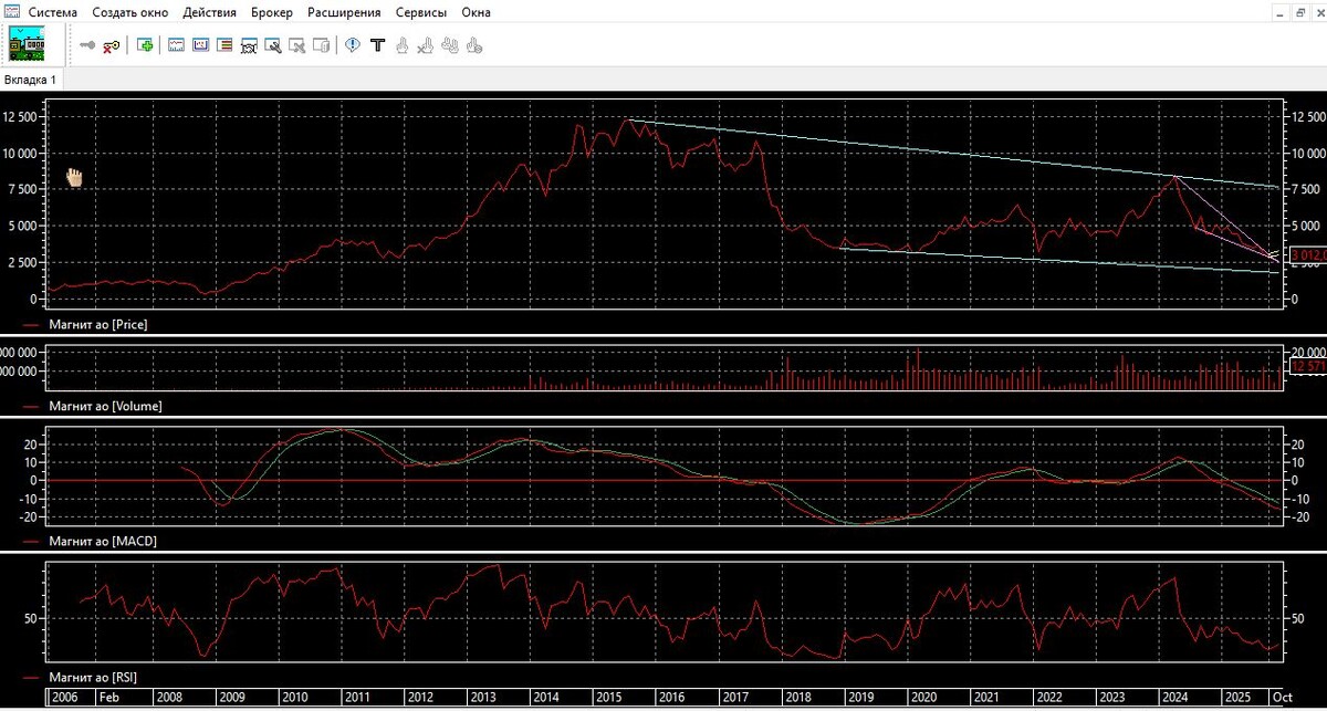 Новостной фон говорит на сайте Финам есть статья: «Что происходит с акциями "Магнита"». Рассказывается, как вела себя акция Магнит в 2025 году, какая перспектива может ожидать в дальнейшем. Рекомендую почитать статью, здесь выставлю абзац: «Перспективы бумаг