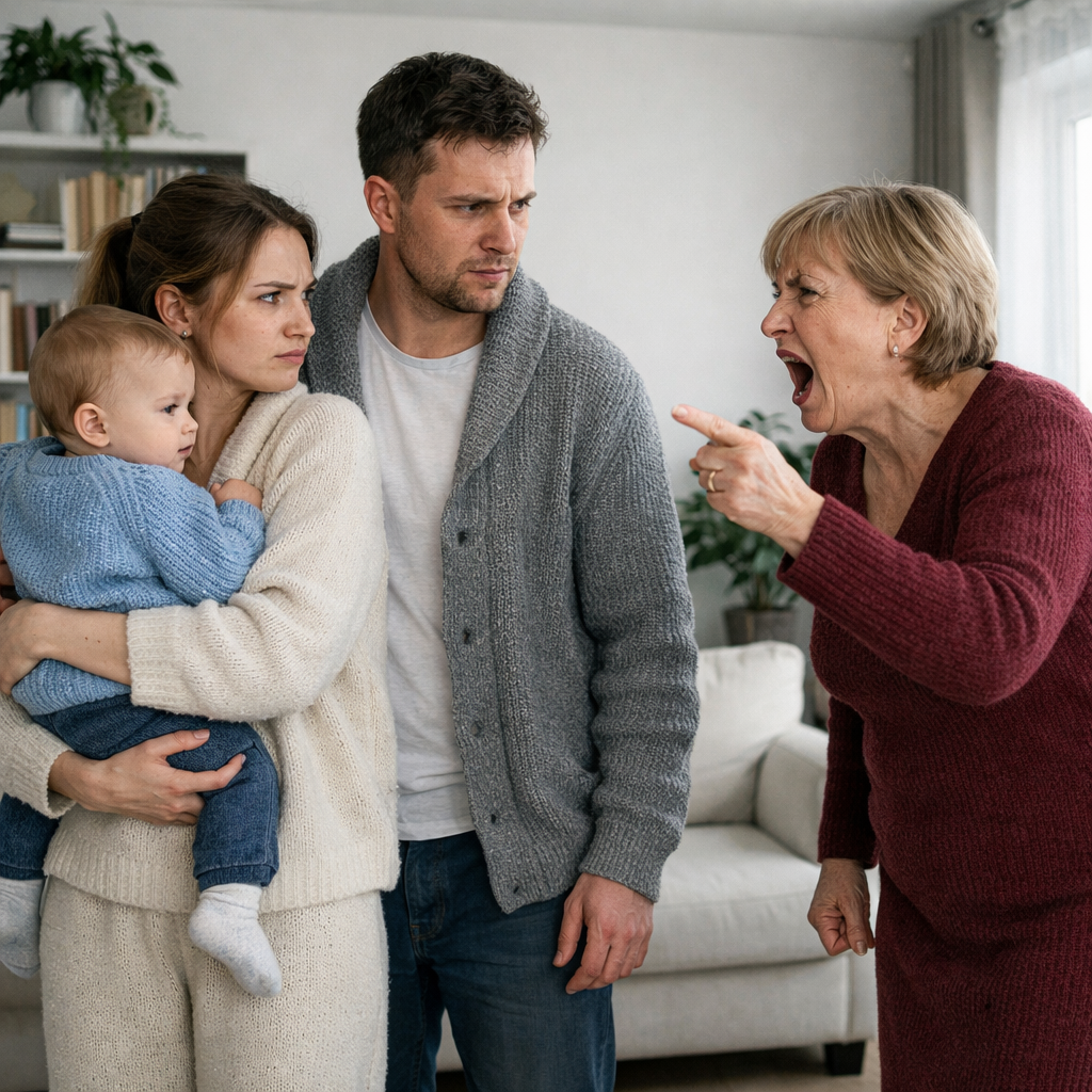 Семён вошёл в гостиную — высокий, уставший, с растрёпанными волосами. Взгляд метнулся от жены с ребёнком на руках к матери, сидящей на диване.