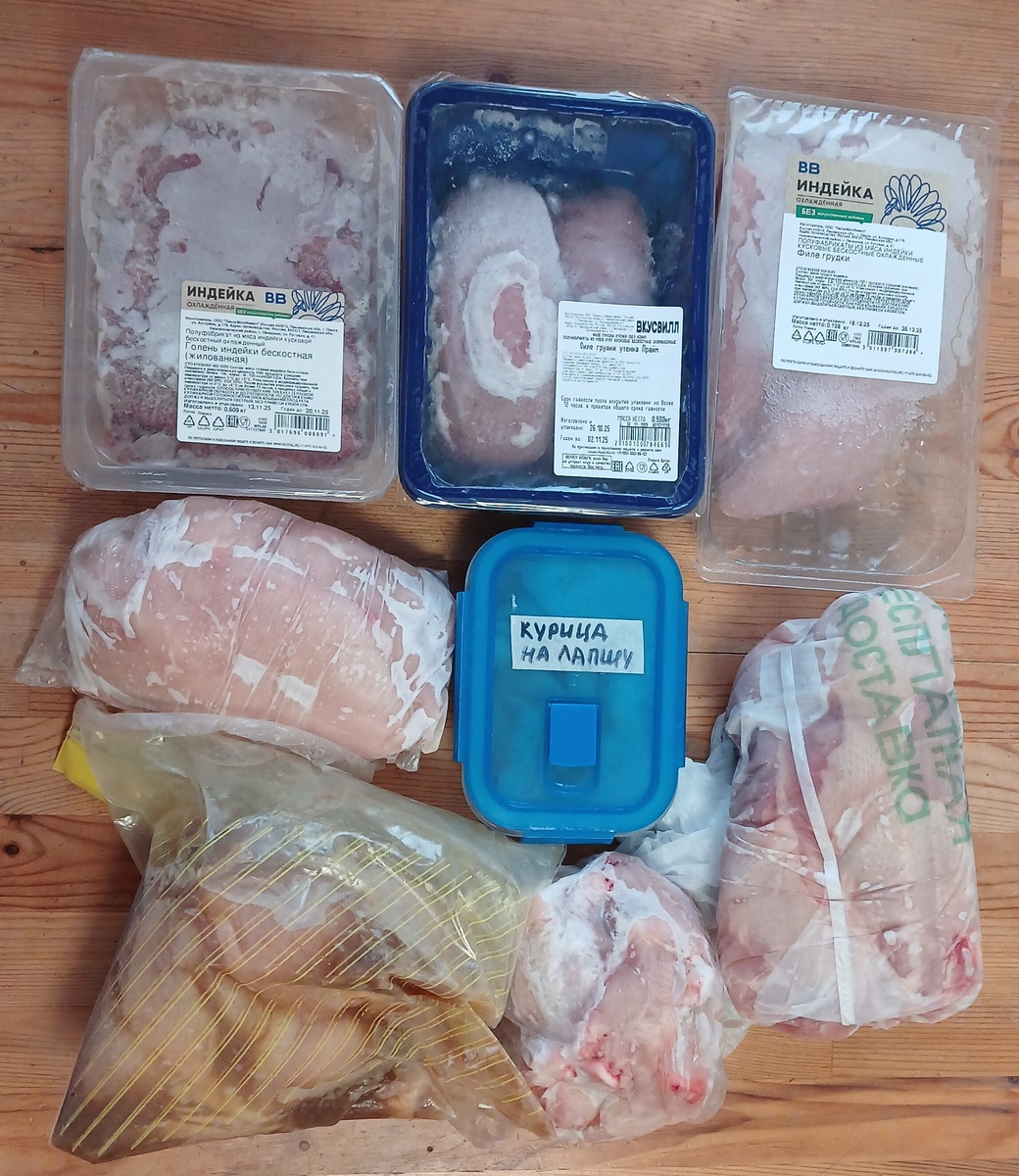 Новый год и начинаем новый отсчет. Я с самого начала ведения своего блога взяла за базу для расчетов суммы на продукты в месяц цифру прожиточного минимума. Половина от него - это как раз сумма на питание. Но мы тратим на питание даже меньше, чем сумма прожиточного минимума. Обычно это 60-80% от этой скромной суммы. С 1 января размер прожиточного минимума вырос. МЯСО, ПТИЦА все это было куплено в ноябре-декабре, в наличии только разные виды птицы - курица, утка и индейка: упаковка филе голени индейки, филе грудки индейки, филе грудки утки, филе грудки курицы, курица на лапшу в нарезке, 2 куриных остова на бульон (обычно бульон варю сразу, но в этот раз разделывала кур 31 декабря и было не до бульона), замаринованные окорочка куриные, пакет с куриными крылышками и есть еще говяжий язык примерно на 2 кг. Его покупали к Новому году, но пока так и не приготовили. кальмары - 3 уп, мидии - чуть больше 1 кг, креветки, 1 кг крабовых палочек, стейки форели и набор для ухи из форели также в х