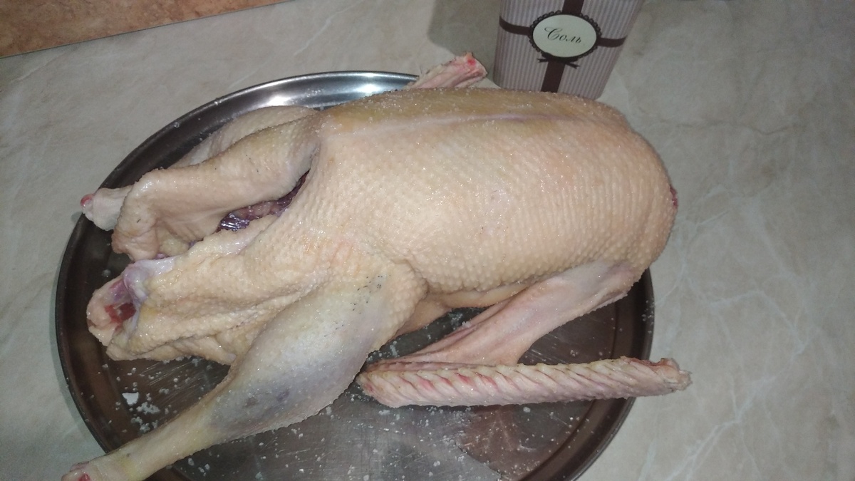 Сочная, румяная, ароматная утка с хрустящей корочкой станет коронным блюдом на вашем праздничном столе. Ее можно запечь без начинки, а можно нафаршировать. Какой бы способ вы ни выбрали - утка покорит всех гостей. 1. Гуся натереть солью снаружи и внутри. Смешать все ингредиенты для маринада и натереть гуся снаружи и внутри. Тушку положить в пакет, грудкой вниз, чтобы хорошо промариновался. Пакет завернуть. Оставить в холодном месте на 12-15 часов. 2. Яблоки и апельсин нарезать на дольки. Нашпиговать гуся. Тушку завернуть в фольгу. Запекать при 200°С - 2 часа. Для запекания выбирайте противень с бортиками, т.к. с гуся вытапливается большое количество жира. 3. Затем раскрыть фольгу. С противня удалить излишки жира. Вокруг утки выложить нарезанные яблоки и айву (это по желанию). Гуся и фрукты полить выделившимся жиром и запекать до румяной корочки. Яблоки могут запечься раньше гуся, поэтому следите за этим процессом, иначе они могут превратиться в пюре. Айва же может запекаться вместе