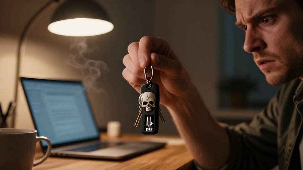 Вечерний свет настольной лампы падал на деревянный стол в коридоре, отбрасывая длинные тени от висящих ключей. Я вернулся домой раньше обычного, с пакетом свежих булочек из пекарни на углу — их аромат корицы ещё витал в воздухе, смешиваясь с лёгким запахом кофе из кухни. Анна была в гостиной, её силуэт мелькал за дверью, пока она расставляла свечи на подоконнике. Но мой взгляд зацепился за ключи: среди привычных — домовой, от машины, от офиса — болтался новый брелок. Маленький, чёрный череп из матового пластика, с серебристыми зубами, поблёскивающими в полумраке. Флешка? Странно. Анна никогда не вешала такие безделушки.