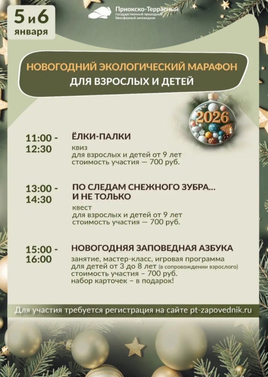 🦬 ❄️ 2-12 января работаем каждый день, чтобы вы могли получить свою порцию свежего воздуха, позитивных эмоций 😉 Ежедневно с 9 до 16 часов в формате экскурсии или квеста. 3, 4, 7, 8, 9, 10 января с 10:30 до 12:30 и с 13:30 до 15:30 будет работать Творческая мастерская (регистрация обязательна) 💫И ещё много всего интересного Записаться и подробнее тут 👉https://clck.ru/3QuPoC 🚫 Возраст: 0+ 🏢 Приокско-Террасный заповедник 📍 г.о. Серпухов, местечко Данки ⭐Поддержать канал голосом ✅ Мероприятия Чехов https://dzen.ru/id/66cc4b48e9ef144699238a51 http://vk.com/chekhov_events http://dzen.ru/chekhov_events