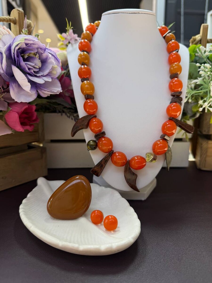 ! ☄ Приближенные к натуральным природным цветам оттенки, даже яркой палитры, можно аккуратно вписать в образ на каждый день. Главное правило – сочетать их с более спокойными цветами той же гаммы, как например, коричневый и оранжевый.🧡 Колье 8000 Серьги 1200 Кольцо 2700 ✨Нажмите для заказа ✉️ Нажмите чтобы задать вопрос