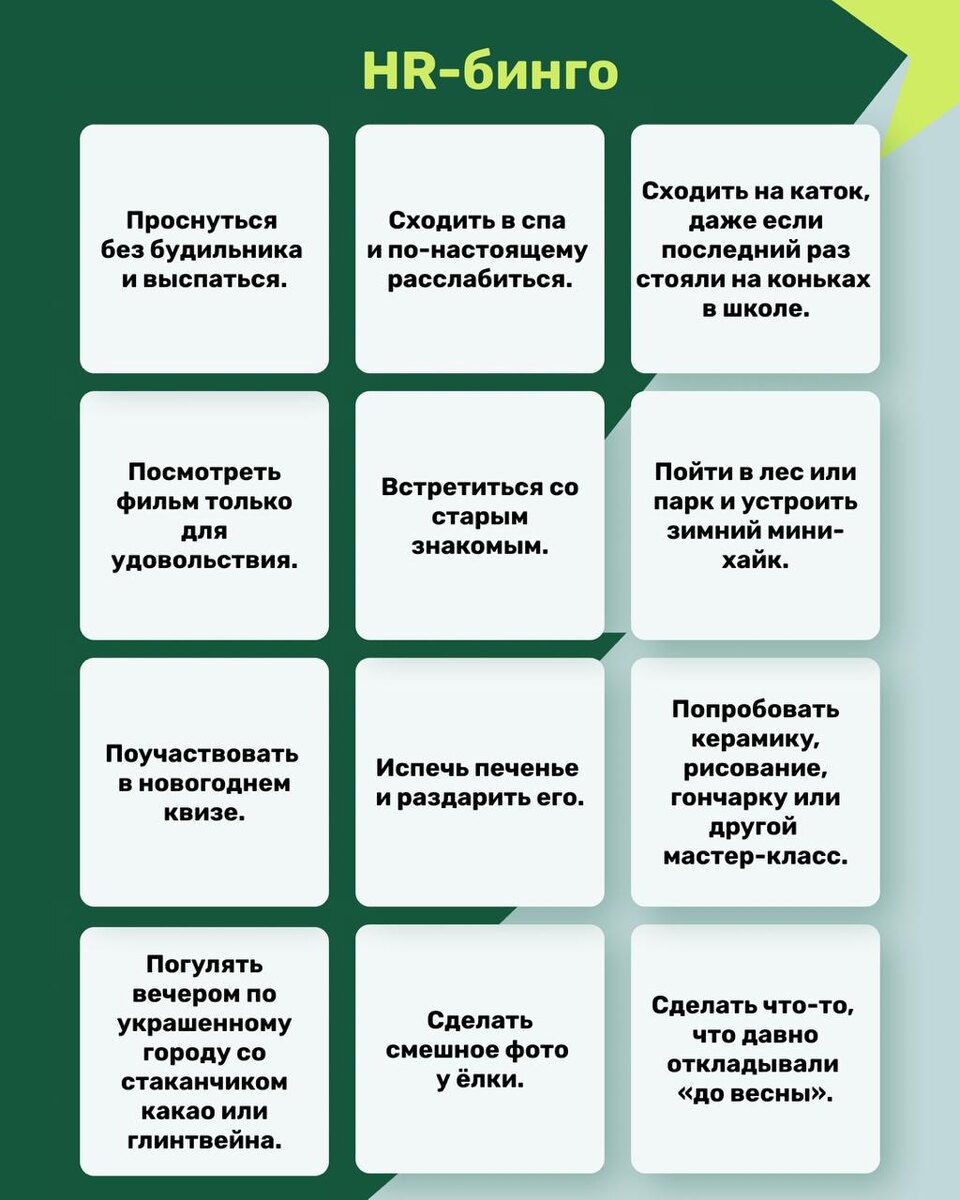 ? Новогодние каникулы часто пытаются превратить в ещё один проект. Мы предлагаем другой подход. Используйте эти дни не для рывка, а для восстановления! Сохраняйте чек-лист и выбирайте то, что действительно откликается 💚