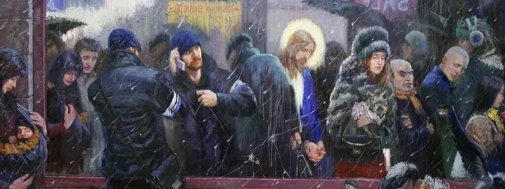 ? Такая боль, что нужно выйти в ночь, Идти по самым тихим закоулкам, Где даже снегу посветлеть невмочь, Где шаг, где эхо не бывает гулким. Где время на петле ворот скрипит, Где вдоль тропы одни слепые окна, У каждого бревна радикулит, Где ветер, вьюга рвутся на волокна. Где стыло пахнет деревом сырым, Где жизнь легла в оббитые кастрюли, Где никогда не наступает Крым, И никаких берёз и люли-люли… Там у оврага виден край всего, Без всяких там морей и океанов, Над ним стоит скамья для одного, Как точка сбора новых окаянных. И там уже давно не ждут гостей. Фонарь согбенный льёт тоску желтушно. И я туда продрогший до костей Пришёл с вопросом глупым, простодушным. На той скамье похожий на бомжа, Плащом пурпурным скрыв худые плечи, Дошедших ждёт, собой не дорожа, Как может только Богочеловечность... Я прошептал или подумал свой вопрос, И Он привстал, не дав мне падать ниц, Ответил Он мне тихо: Я – Христос… И с плеч Своих отдал мне плащаницу. А в городах салюты и огни, Шампанское и Нов