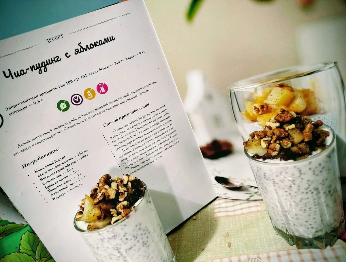 )) Пудинги с семенами чиа. Семена чиа - очень полезный продукт. Сегодня два пудинга в качестве десерта. 1. Чиа-пудинг по "Осознанной кулинарии Д. Савельевой и Д. Третьяковой. Добавляла подсластитель, делала на кефире. 2. Чиа-пудинг Елены Некрасовой с яблочным пюре. Похож на первый, но плюсом яблочное пюре внутрь к йогурту. Я делала из кефира вместо йогурта. А сверху можно вместо яблок карамелизированных ягоды или другие фруктики нарезать, орешки по вкусу. Смазывала просто сметаной. Привожу рецепт Елены. "250 г пюре из печеных яблок 4 ст. л семян чиа 250 г густого йогурта без добавок 1 яблоко для украшения ½ ч. л корицы или специй для яблочных пирогов 1 ч. л сливочного /кокосового масла Аллюлоза (или сахар) для карамелизации яблок Яблоки можно очистить, но я оставляю с кожурой. Взвесьте целые яблоки, для получения 250 г пюре вам понадобится больше на 50-80 г в зависимости от размера яблок. Разрезать на 4 части, запечь при 180 С до полной мягкости около 15-20 минут. Яблоки остудить,