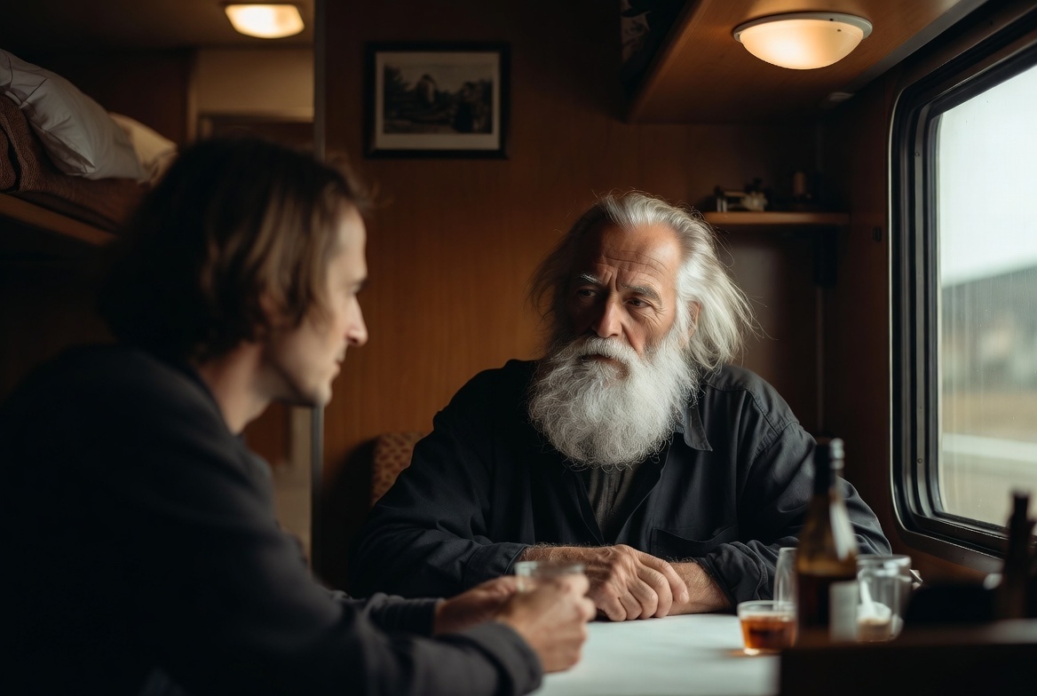 Путешествие началось как нельзя лучше. В купе, помимо меня, оказался пожилой мужчина, приятный в общении, с добрыми глазами и седой бородой. Мы разговорились, и, как положено в таких случаях, достали из своих запасов по рюмашке. Разговор тек легко, воспоминания переплетались с планами на будущее, а за окном мелькали огни зимних городов. Я чувствовал себя расслабленным и счастливым, предвкушая встречу с другом и праздничную ночь.