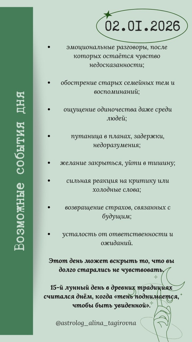 2️⃣ января, пятница В 14:12 начало 1️⃣5️⃣-го Лунного дня Растущая Луна в знаке ♋️Рак Общая характеристика дня День накануне Полнолуния — это всегда пик внутреннего напряжения, но сегодня он проживается особенно тонко. Луна в Раке усиливает эмоциональную память, уязвимость, потребность в безопасности и поддержке. А напряжённые аспекты к Меркурию, Сатурну и Нептуну создают ощущение, будто чувства и реальность говорят на разных языках. 15-й лунный день считается днём искушений и проверок. Всё, что не прожито честно, сегодня может выйти наружу через эмоции, обиды, сомнения, тревоги. Это день: эмоциональной перегрузки, внутренних конфликтов между «чувствую» и «надо», сомнений в словах, обещаниях, договорённостях, повышенной впечатлительности, иллюзий и разочарований, необходимости остановиться и услышать себя. Оппозиция Луны и Меркурия создаёт конфликт между сердцем и разумом: трудно объяснить словами то, что чувствуешь. Квадратуры к Сатурну и Нептуну усиливают усталость, ощущение нео