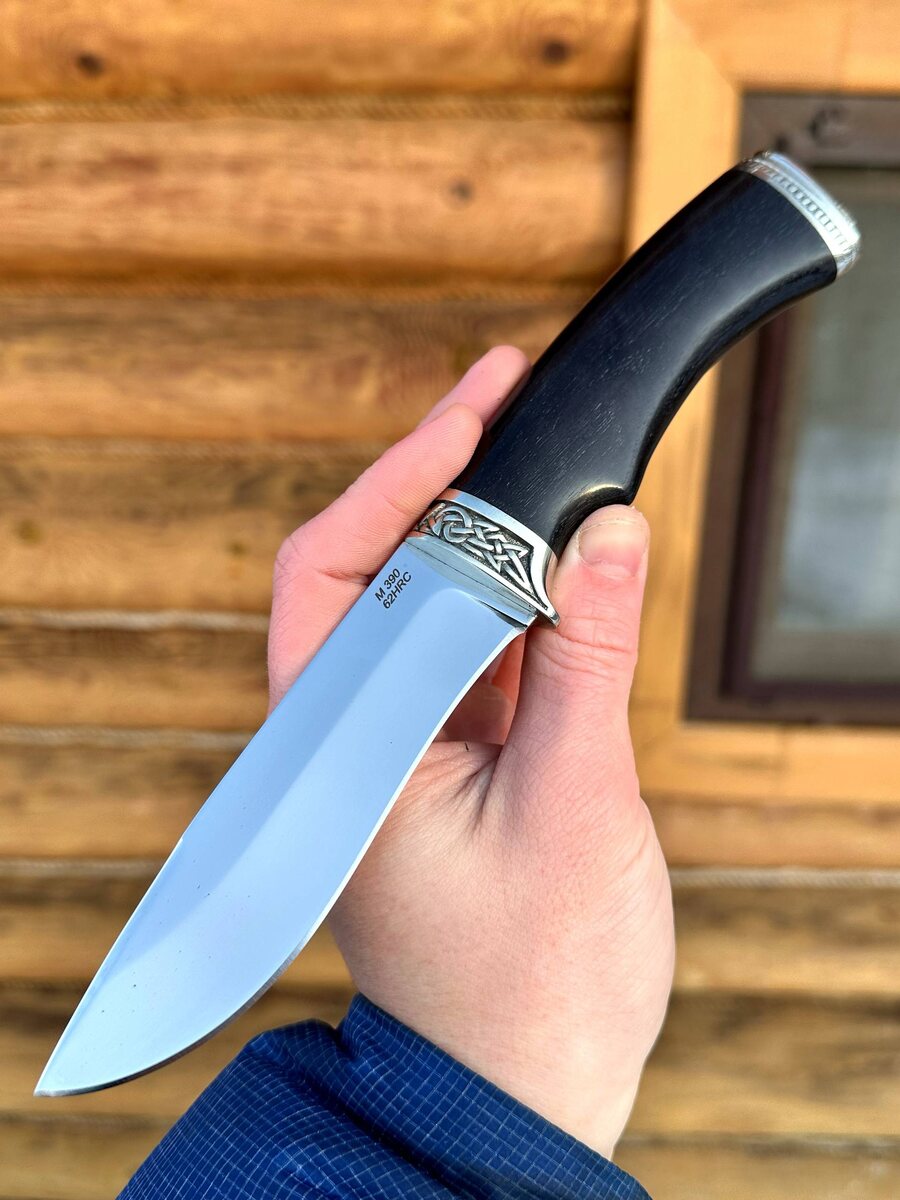 чёрного граба и мельхиора. Сталь M390 обладает высокой твердостью (HRC 62, после криообработки), хорошо держит заточку, имеет хорошую пластичность. Размеры ножа: длина клинка 118 мм, ширина 31 мм, толщина 2,4 мм, длина рукояти 122 мм. На клинке чуть вогнутая линза от середины спусков, фальшлезвие на передней части обуха, финишная полировка в зеркало, заточен до бритвенного состояния. Цена ножа 15.142 руб., обычная цена 20189 руб. Можем изготовить формованные ножны из кожи растительного дубления (+ 8000 руб.) Для заказа писать на @Nazarklinokbot или по тел +79101343831, WhatsApp, Viber.