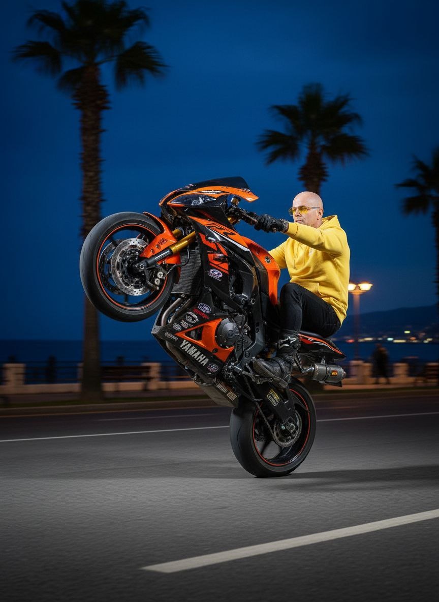 Его лицо и прическа взяты с эталонного изображения, на нем мотокроссовые очки, желтая толстовка без логотипов, темные мотокроссовые штаны, черные перчатки и прочные ботинки. Мотоцикл оранжево-черного цвета с графическими деталями, спицованными колесами, низкопрофильными дорожными шинами, большим спортивным выхлопом и наклейками с логотипами брендов (например, Yamaha). Переднее колесо поднято под острым углом. Действие происходит на оживленной дороге, Сочи, задний фон море и пальмы, городские огни размыты сильным эффектом размытия движения, чтобы показать скорость. Профессиональное кинематографическое освещение подчеркивает гонщика и мотоцикл, создавая драматические тени и контраст. Ультрареалистичный стиль спортивной фотографии высокого разрешения, четкие детали гонщика, яркие цвета и центрированная композиция ➡️ Тут БОТЫ 👉 канал в Дзен 💰Отблагодарить