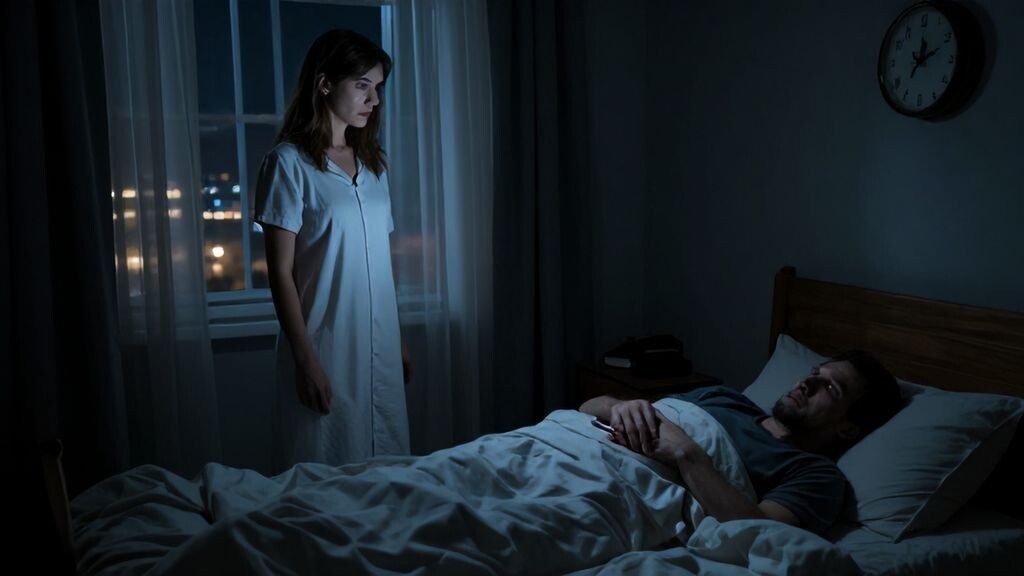 Ночью я снова проснулся. Воздух в спальне казался густым, пропитанным запахом ее духов — легким, цветочным, с ноткой мускуса. Я замер, дыша ровно, притворяясь спящим. Шорох — едва уловимый, как шелест страниц. Приоткрыв глаза в узкую щель, я увидел ее. Марина стояла у кровати в длинной белой ночной рубашке, силуэт подсвечен уличным фонарем сквозь тонкие шторы. Лицо ее было в полумраке, но свет выхватил контуры: высокие скулы, прямой нос, губы сжаты в тонкую линию. Ни любви, ни злобы — только холодное, изучающее выражение, словно у ученого, наблюдающего за подопытным кроликом.