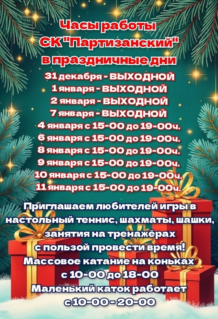 Так, 4, 6, 8, 9, 10 и 11 января СК «Партизанский» будет работать с 15:00 до 19:00. В это время гости смогут поиграть в настольный теннис, шахматы и шашки, а также позаниматься на тренажёрах. 7 января – выходной. Массовое катание на коньках организовано ежедневно с 10:00 до 18:00, а малый каток будет открыт для посетителей с 10:00 до 20:00. 🌐 Сайт | 📱 Telegram | 📱 ВК | 📱 ОК | 📱 Дзен