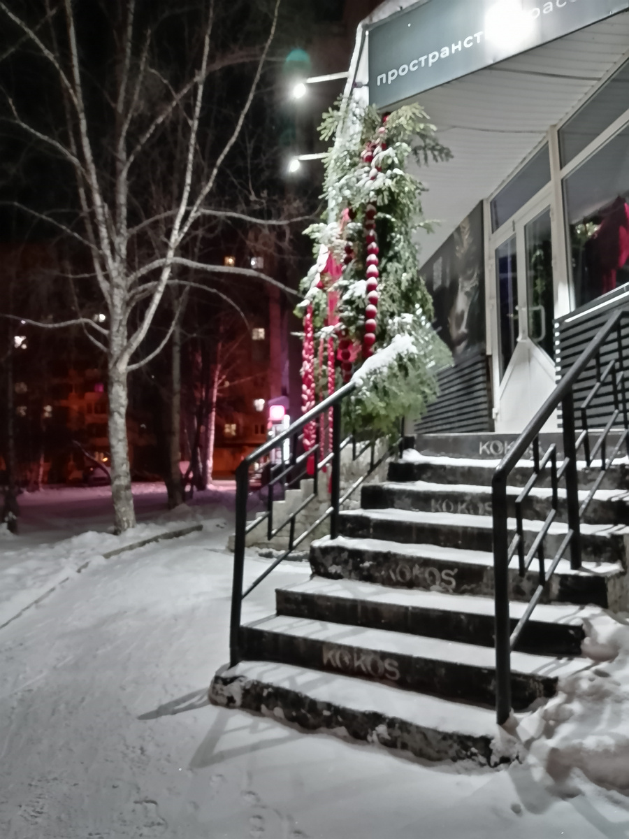 Вечером перед Новым годом пошли мы с Басей прогуляться. В семь часов вокруг тихо и пусто. Народ дома салаты делает да столы накрывает. Вот увидела только признак праздника: Прошлись по дворам и пошли домой смотреть телевизор. Смотрела один канал. Сначала комедии, потом киноконцерт. На салюты из окна полюбовалась: После двенадцати отправила сыну подарок на день рождения. Позвонила ему, поздравила. У него двойной праздник. С Новым годом поздравились все днем 31. Так что ночью никому больше не звонила. Спать легла в час, но уснуть не могла почти до четырёх. То салюты гремят, то собака лает. Она у меня гавкает, как только услышит шаги на площадке. Проспала почти до девяти часов, и снова вышли на прогулку. Утром 1 января тишина в городе звенящая. Оживлённая обычно трасса совершенно пустая. Даже слышно, как гремит металл на заводе. Глубокой ночью во время бессонницы с балкона тоже бывает слышу этот глухой грохот. Но днем не слышала ещё. А вот такие напоминание о прошедшем праздновани