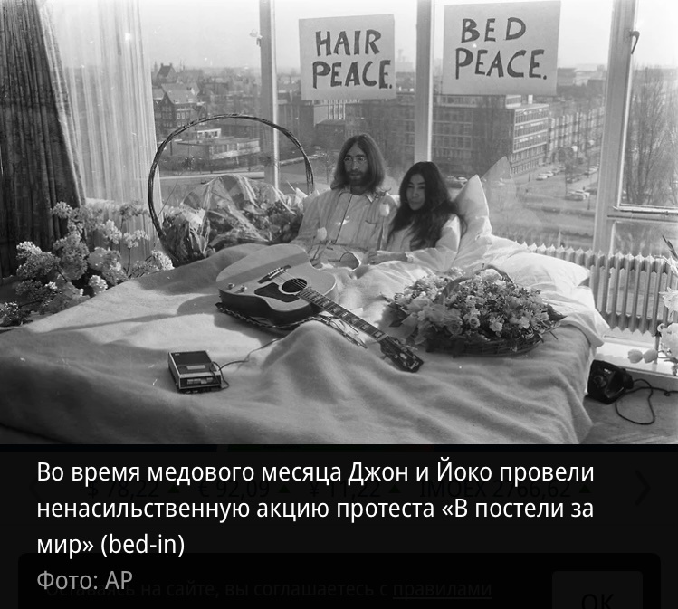 Во время медового месяца Джон и Йоко провели акцию протеста против войны во Вьетнаме — в постели в номере 702 отеля Hilton в Амстердаме. Ежедневно в течение недели представители прессы могли заходить в номер к молодоженам с девяти утра до девяти вечера. Видеозаписи, сделанные в гостиничном номере, впоследствии вошли в документальный фильм «Bed Peace».
