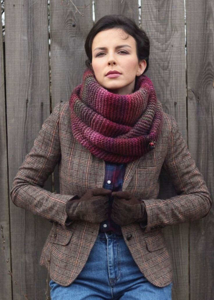 Снуд в один оборот, вязка плотная, чаще с односторонним рисунком. Лучше из шерстяной пряжи.