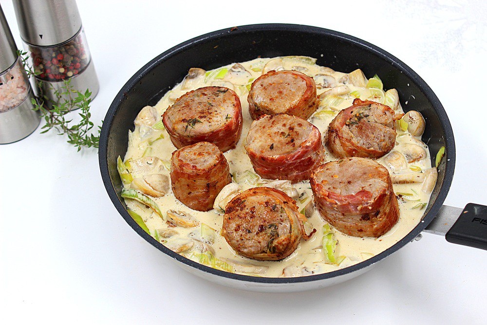π ΠΠ½Π³ΡΠ΅Π΄ΠΈΠ΅Π½ΡΡ: - Π‘Π²ΠΈΠ½Π°Ρ Π²ΡΡΠ΅Π·ΠΊΠ° β 500 Π³. - ΠΠ΅ΠΊΠΎΠ½ (ΡΠΎΠ½ΠΊΠΈΠ΅ Π»ΠΎΠΌΡΠΈΠΊΠΈ) β 150-200 Π³. - Π¨Π°ΠΌΠΏΠΈΠ½ΡΠΎΠ½Ρ β 300 Π³. - ΠΡΠΊ ΡΠ΅ΠΏΡΠ°ΡΡΠΉ β 1 ΡΡ. - Π‘Π»ΠΈΠ²ΠΊΠΈ 20% β 200 ΠΌΠ». - ΠΠ°ΡΠ»ΠΎ ΡΠ°ΡΡΠΈΡΠ΅Π»ΡΠ½ΠΎΠ΅ β 2 ΡΡ.Π». - Π‘ΠΎΠ»Ρ, ΠΏΠ΅ΡΠ΅Ρ ΡΠ΅ΡΠ½ΡΠΉ ΠΌΠΎΠ»ΠΎΡΡΠΉ β ΠΏΠΎ Π²ΠΊΡΡΡ. - ΠΠ΅Π»Π΅Π½Ρ Π΄Π»Ρ ΠΏΠΎΠ΄Π°ΡΠΈ. π§π»βπ³ ΠΡΠΈΠ³ΠΎΡΠΎΠ²Π»Π΅Π½ΠΈΠ΅: 1. Π‘Π²ΠΈΠ½ΡΡ Π²ΡΡΠ΅Π·ΠΊΡ Π½Π°ΡΠ΅Π·Π°ΡΡ Π½Π° ΠΊΡΡΠΎΡΠΊΠΈ ΡΠΎΠ»ΡΠΈΠ½ΠΎΠΉ 3 ΡΠΌ, ΠΏΠΎΡΠΎΠ»ΠΈΡΡ ΠΈ ΠΏΠΎΠΏΠ΅ΡΡΠΈΡΡ. ΠΠ±Π΅ΡΠ½ΡΡΡ ΠΊΠ°ΠΆΠ΄ΡΠΉ ΠΊΡΡΠΎΡΠ΅ΠΊ ΠΏΠΎΠ»ΠΎΡΠΊΠΎΠΉ Π±Π΅ΠΊΠΎΠ½Π°. 2. ΠΠ±ΠΆΠ°ΡΠΈΡΡ ΠΌΠ΅Π΄Π°Π»ΡΠΎΠ½Ρ Π½Π° Ρ