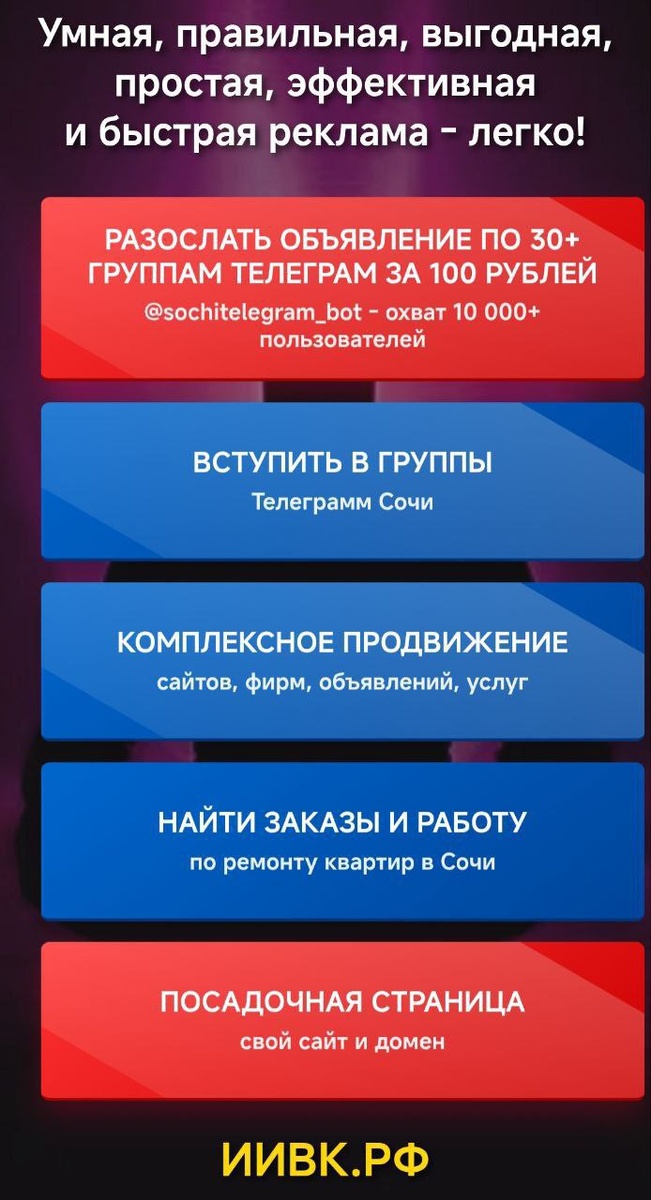 ? Нужны клиенты уже сегодня, а не завтра? Мечтаете о простом и дешёвом способе продвижения? Тогда этот лайфхак для вас. Забудьте о сложной настройке рекламы. Просто зайдите в бота: https://t.me/sochitelegram_bot Выберите «Рассылка за 100 руб», отправьте текст с телефоном — и ваше предложение увидят в 30+ группах Телеграм моментально. Хотите сэкономить всё? Размещайте бесплатно сами: • http://t.me/bbssochiru • http://t.me/rabota_sochi_krasnodarskiy_kray • http://t.me/dosochiru Полный список: https://www.groups-sochi.bbssochi.ru/ Другие варианты: • 300 руб — рассылка + закреп в ТОП. • 500 руб — доступ к ссылкам на группы. Есть вопросы? Пишите: Telegram: https://t.me/Andrey220280 WhatsApp: https://wa.me/79186086929 Начните получать заявки уже сейчас: https://t.me/sochitelegram_bot #Лайфхак #Телеграм #Рассылка #Продвижение #Экономия