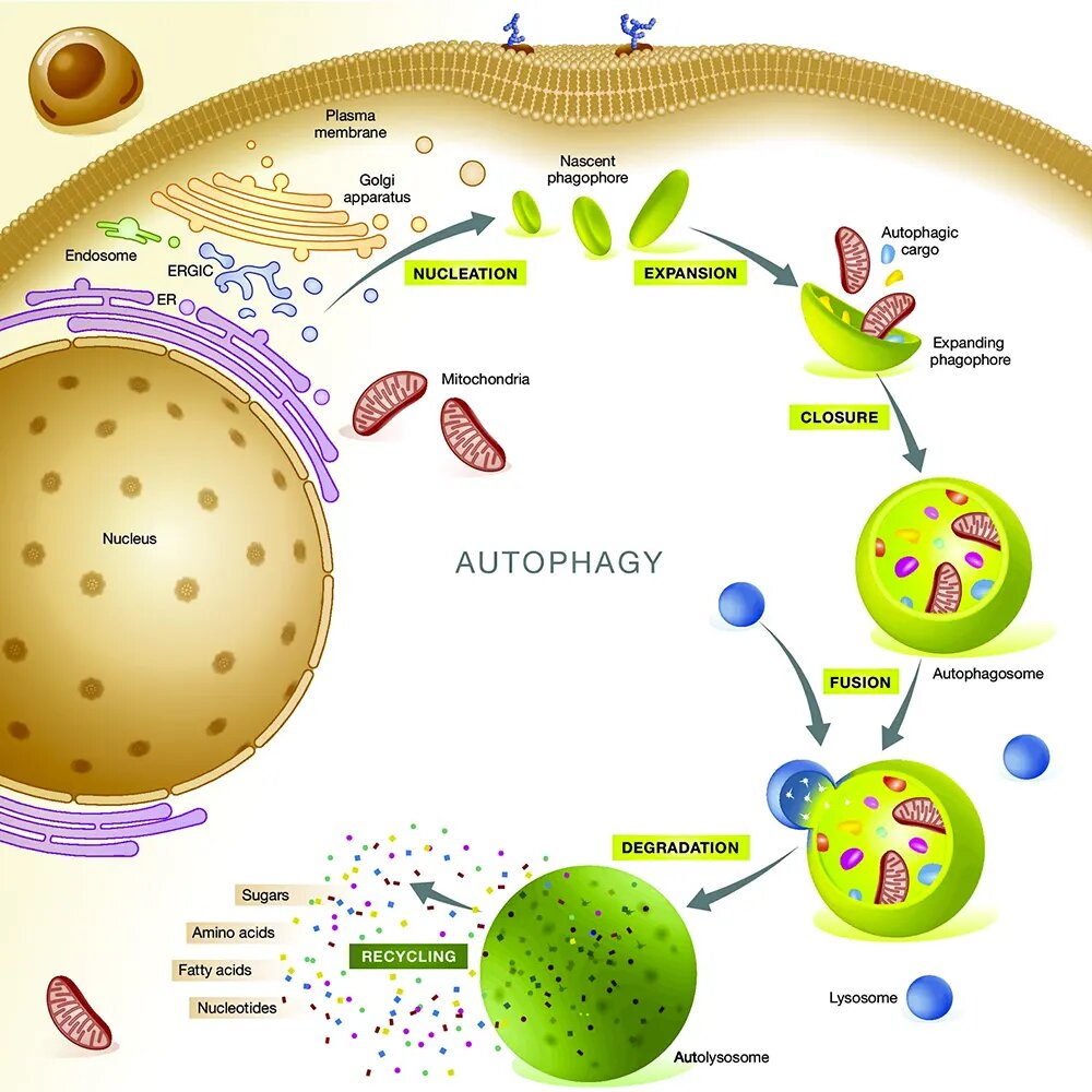 Аутофагия – это механизм избавления от всех выполнивших свою роль старых клеточных структур – органелл (своеобразные «органы» клетки), белков, жиров, углеводов, компонентов клеточных мембран и многого другого.