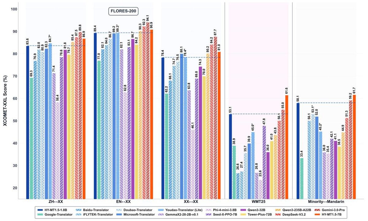 переводу на тюркские языки (будет идти до конца праздников) тем более, что появился повод, прямо под ёлочку 🎄 Tencent выпустили обновление своих моделей для машинного перевода Hunyuan 1.5 (если я правильно понял, то наилучшим переводом 混元 будет "первичный бульон", как источник для всего разнообразия жизни) коллеги выпустили две новых модели 1.8B и 7B, результаты (на картинке) впечатляют - бьют специализированные переводчики от Google и Microsoft, правда, проигрывают Gemini Pro (что, конечно, неудивительно) кстати, часть результатов на FLORES-200, который среди 200 языков включает башкирский, казахский, кыргызский и татарский, так что можно залететь в соревнование с этими моделями; присоединяйтесь! @valuableai