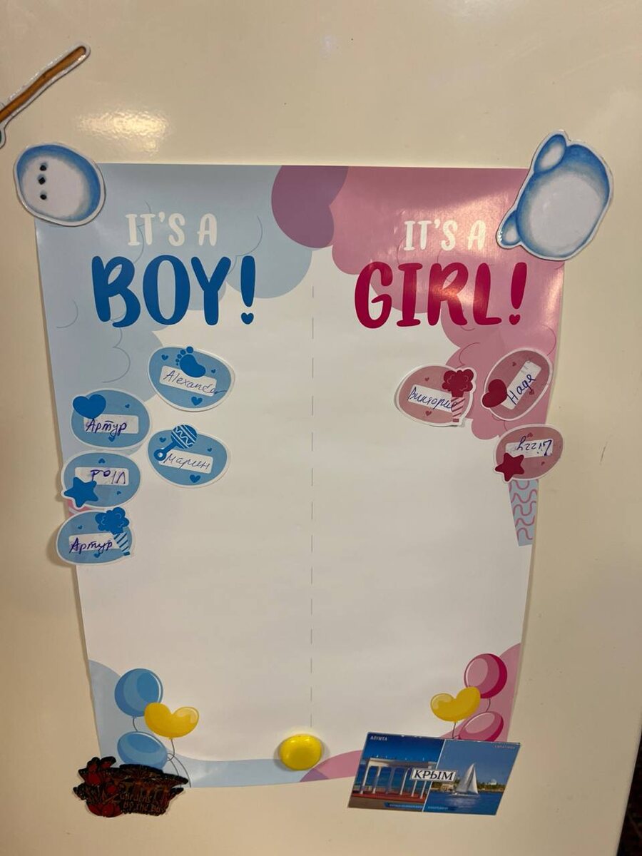 Приходим... весь зал украшен в розово-голубых оттенках. Расселись, Ксюша с мужем, раздают нам красивые листочки с анкетой - задача, написать пол, вес, дату рождения, рос и придумать имя ребенку. Все анкеты собираются и вывешиваются на доску. Считаются голоса за выбранный пол ребенка и делаются прогнозы. Всем смешно, когда обсуждаем имена - вспоминают причины выбора и родственников и знакомых с этими именами, разные веселые истории. У нас получилось 60% голосов за мальчика, 40% - девочка.